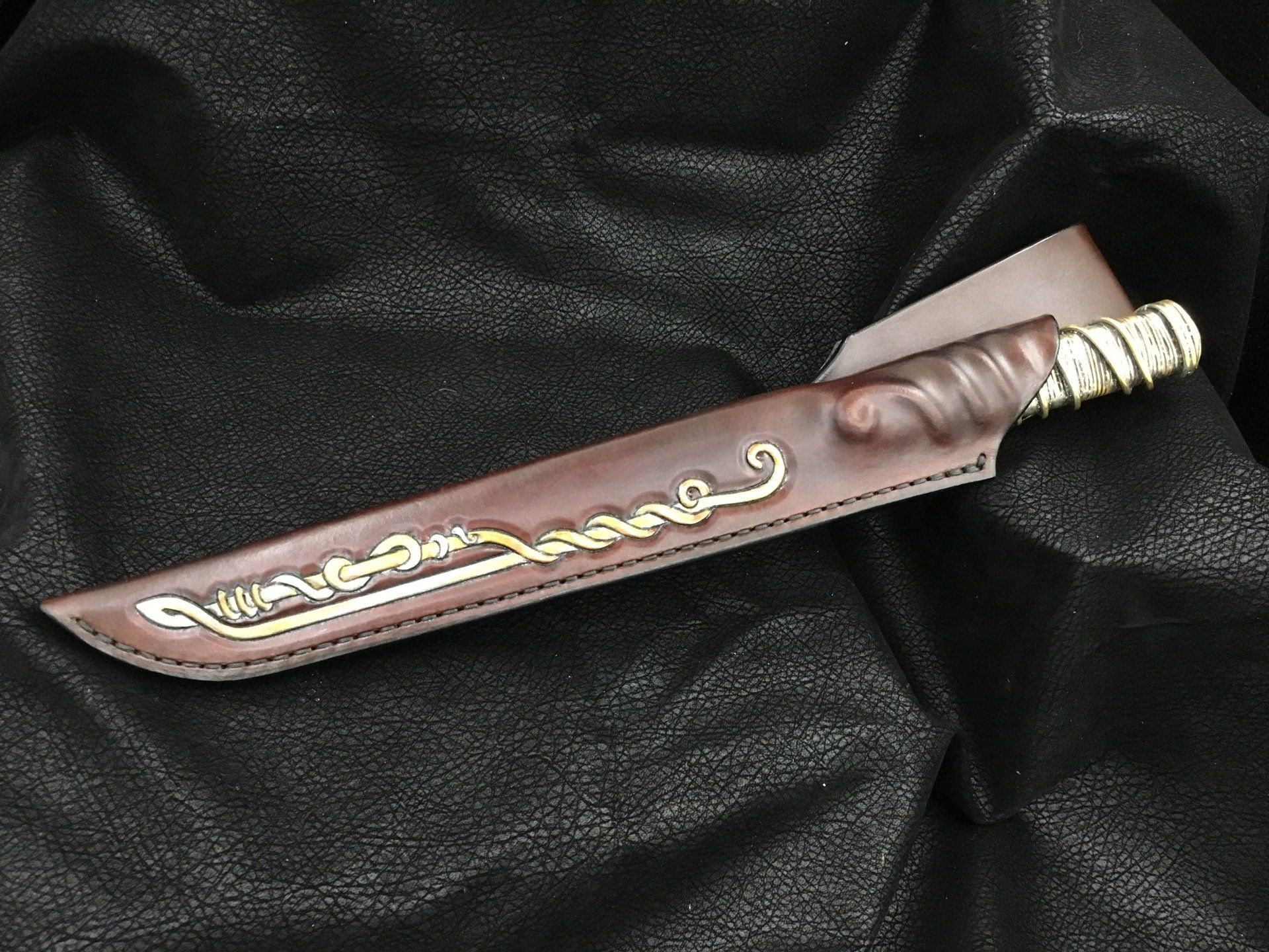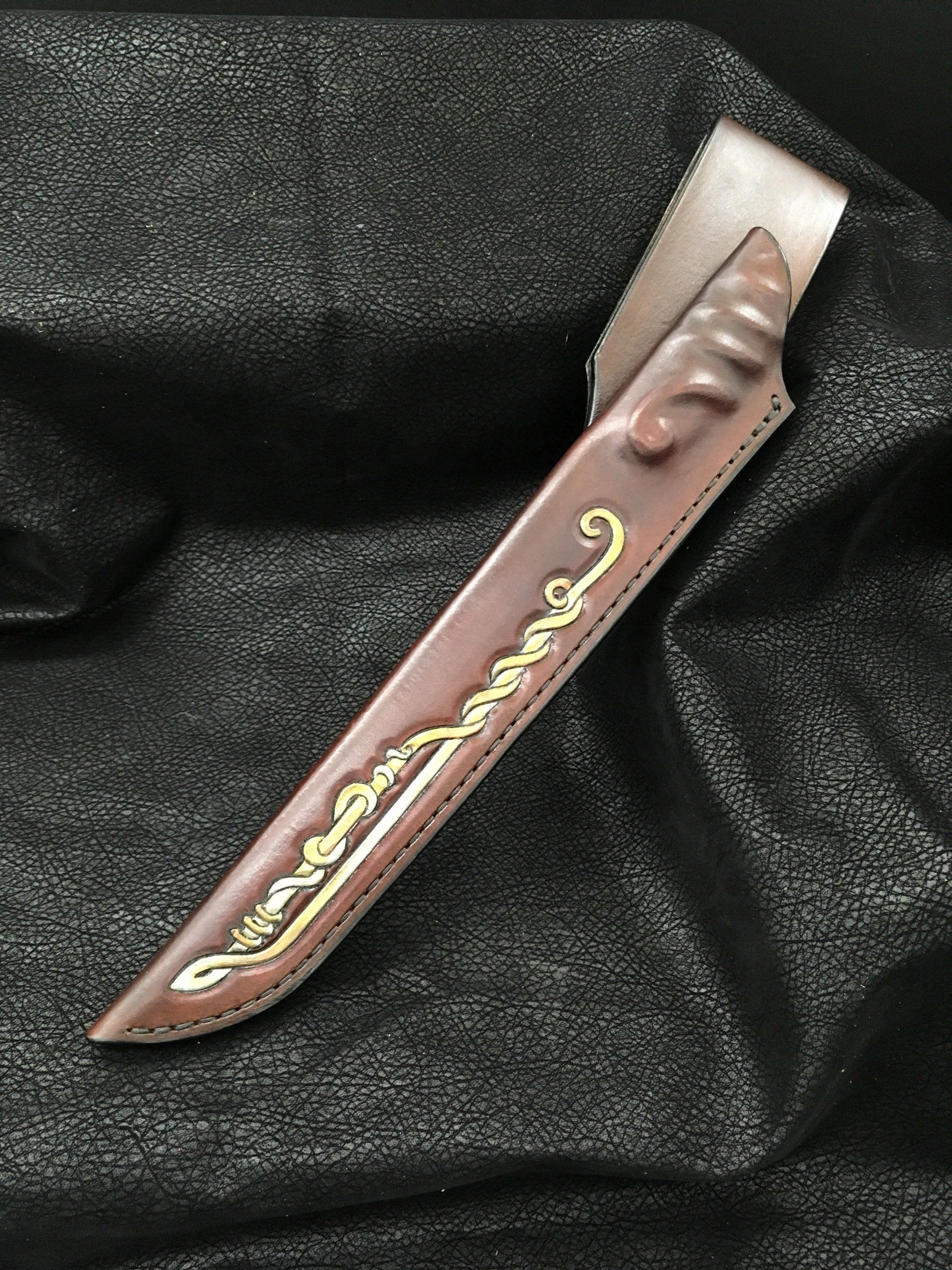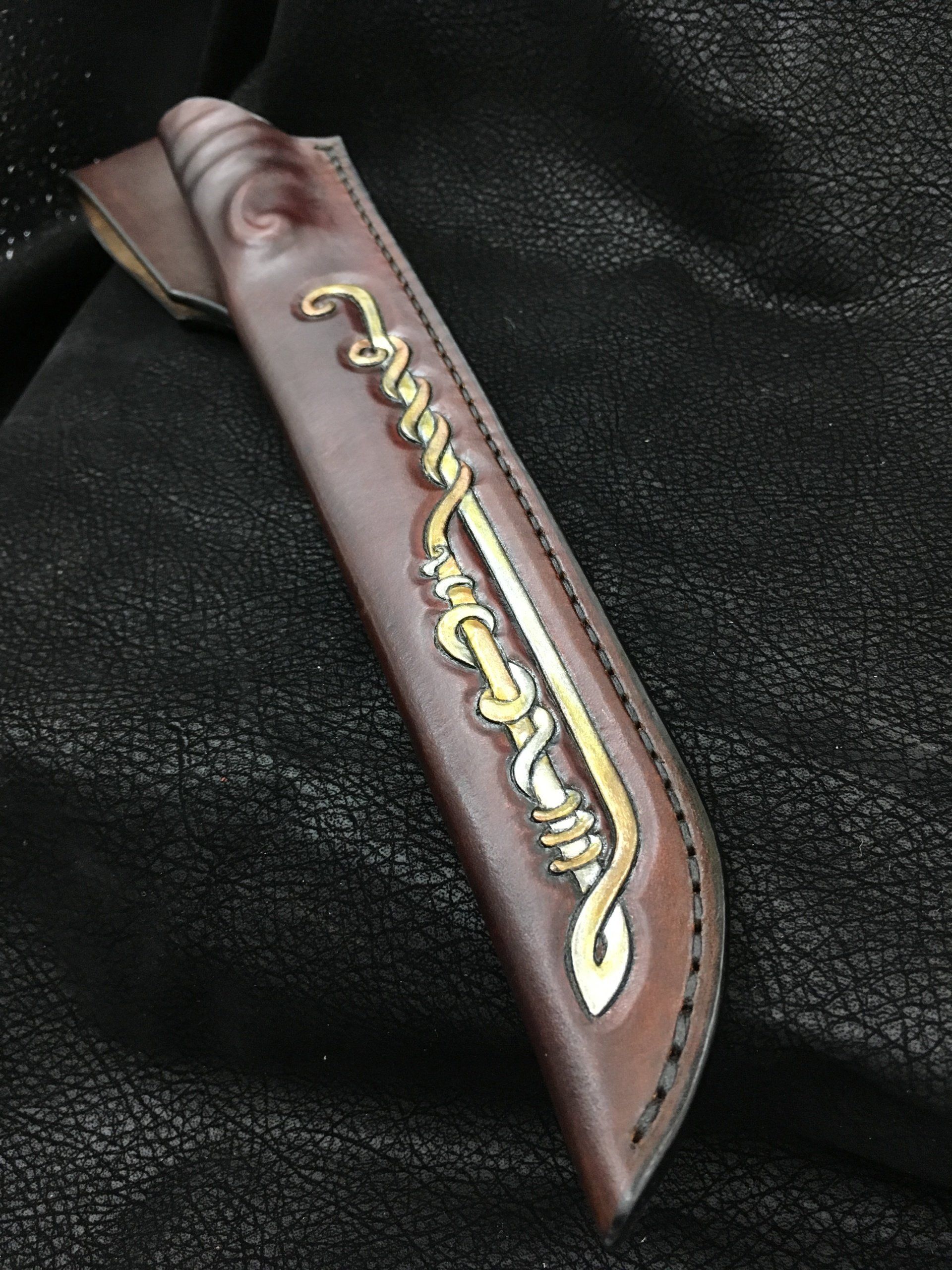 A Custom created knife sheath Tooled with a art deco inspired design of line and scroll work. Dyed a rich mahogany hue and painted with silver, gold and copper leather paints.