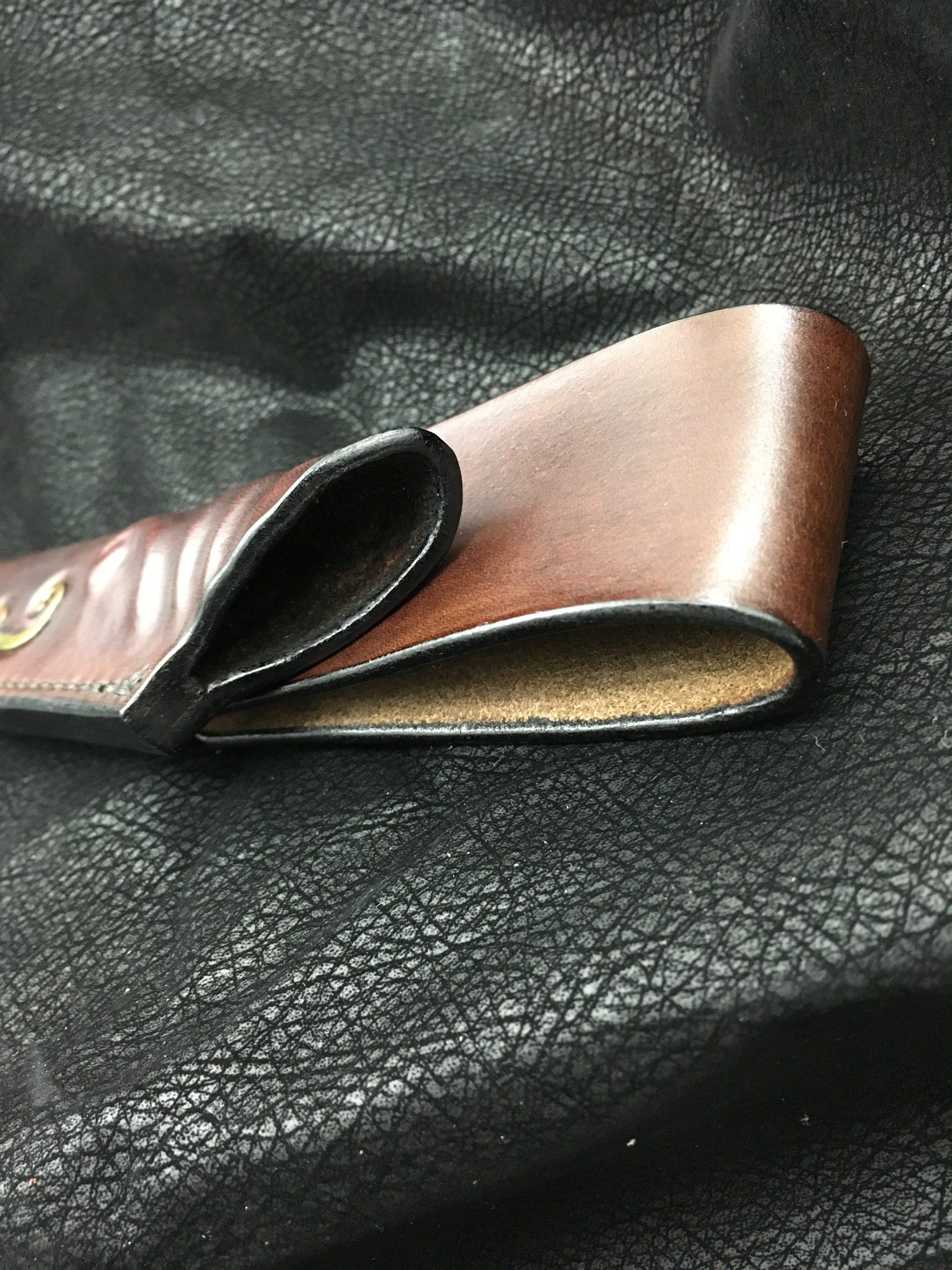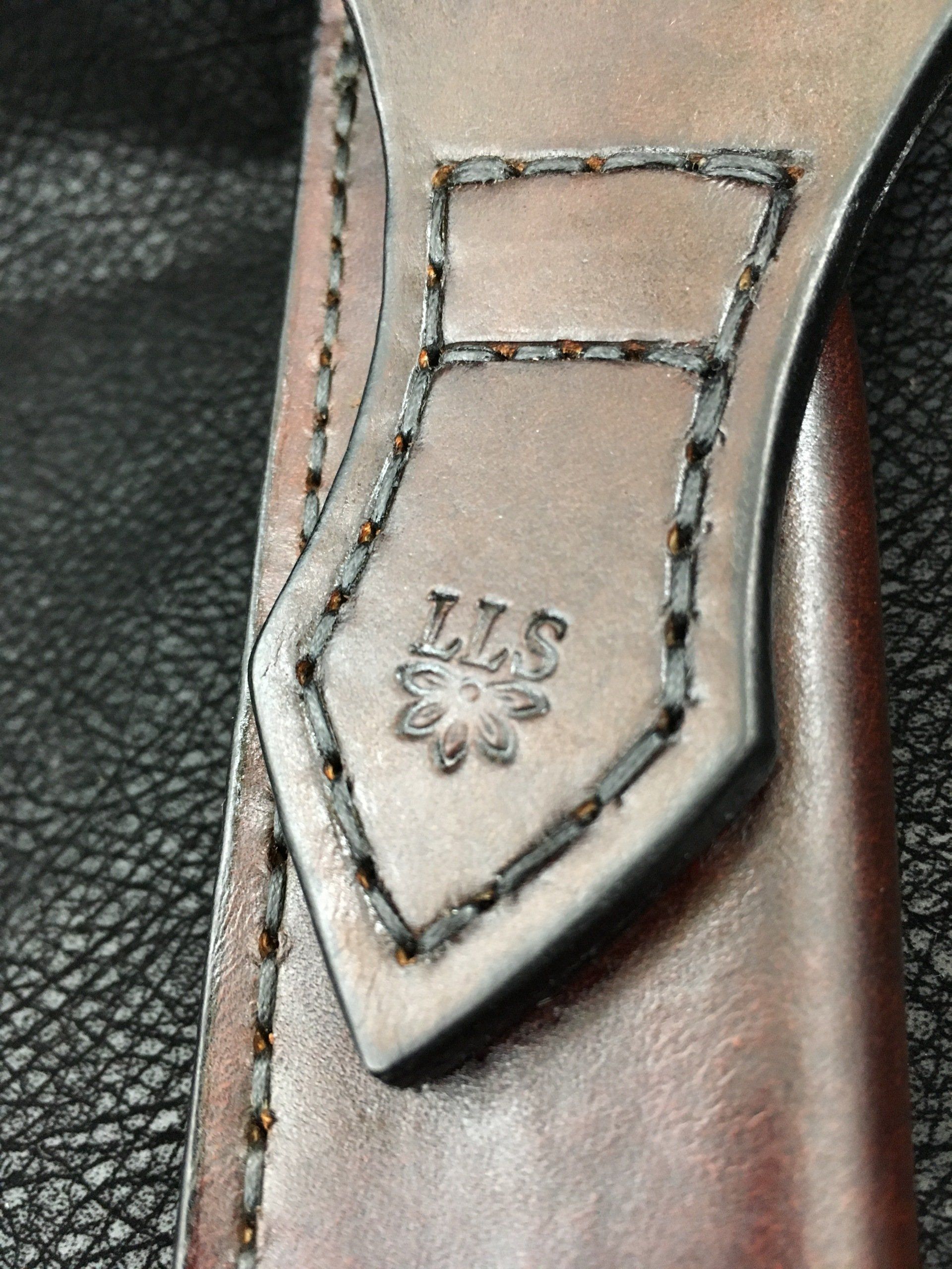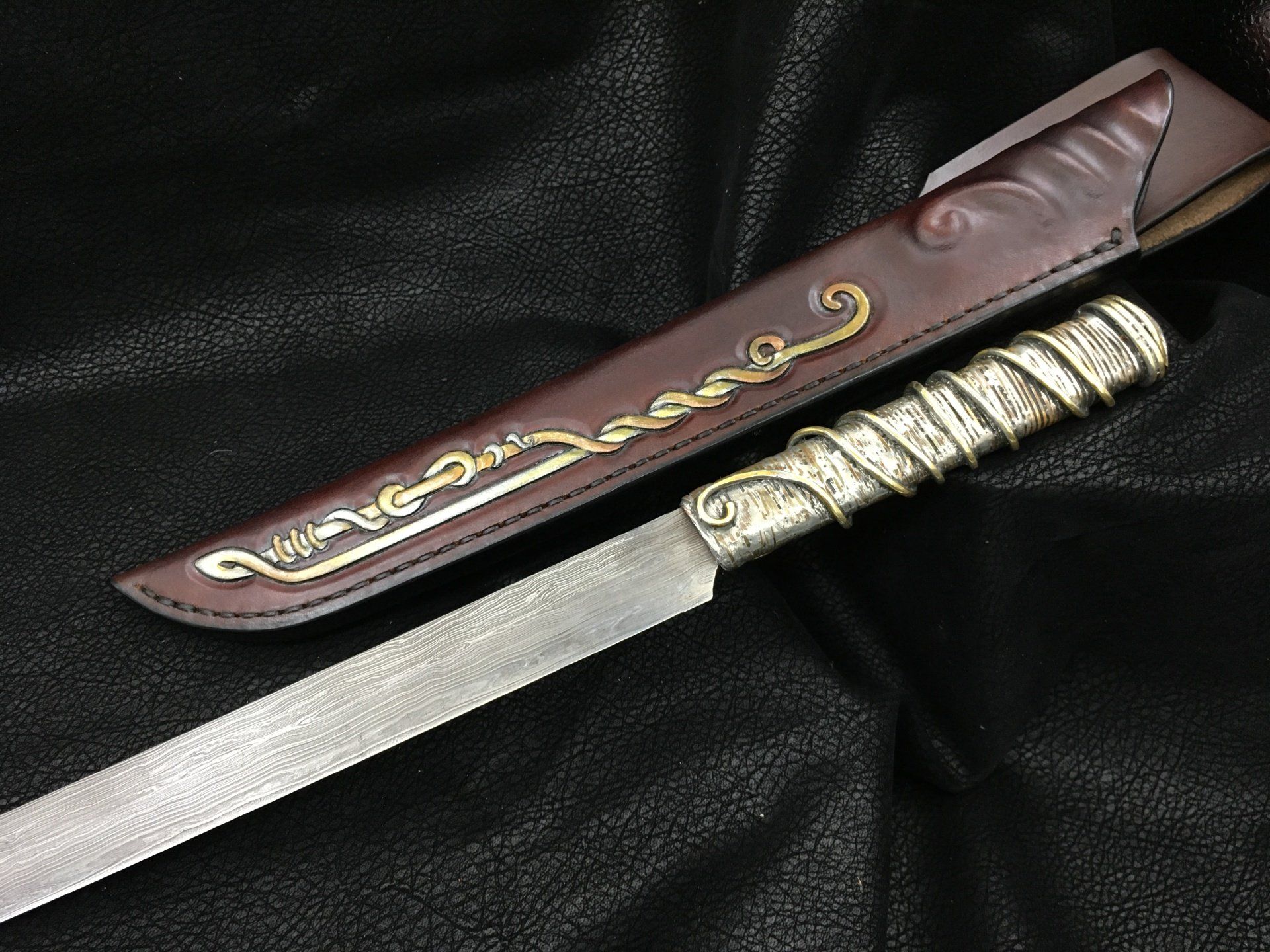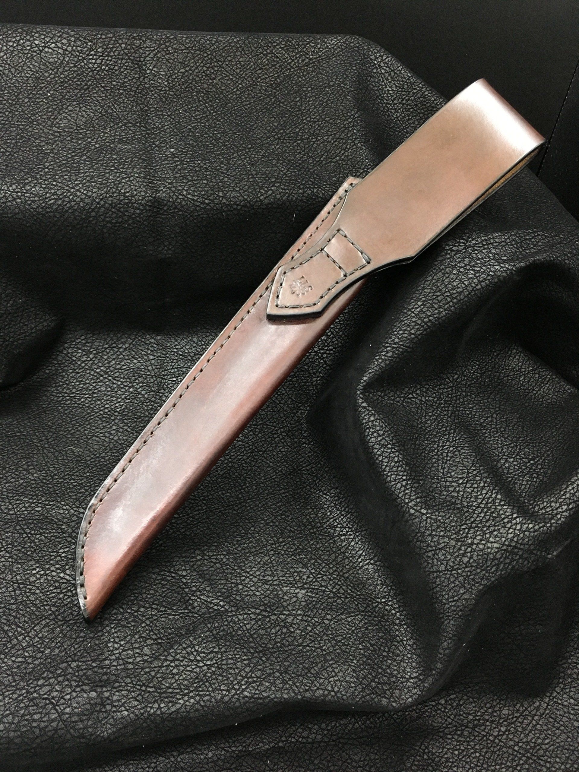 A Custom created knife sheath Tooled with a art deco inspired design of line and scroll work. Dyed a rich mahogany hue and painted with silver, gold and copper leather paints.