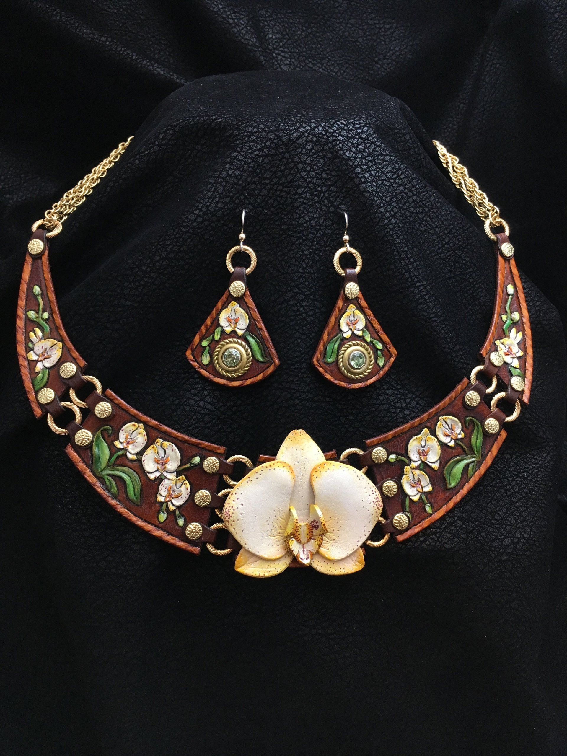 A unique blend of tooled leather, molded leather orchid, metal rivets and jewels makes up this beautiful Orchid's Paradise Collar Necklace set.
